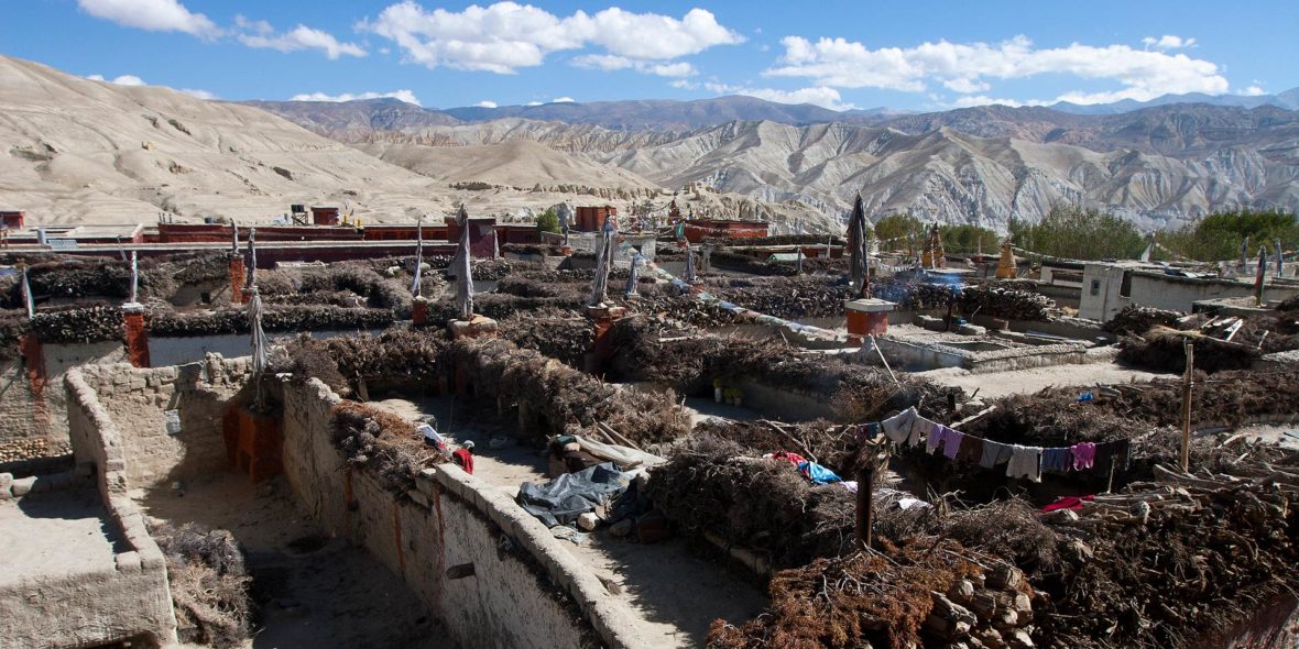 After the pass the trail again drops to Tange village at an elevation of 3370m, entering through the distinctive tri-colour chortens that are such a classic part of the Mustang landscape. Tange is a small village of around 30 houses; most those being attached to each other. On the rooftops one can see piles of dry wood and branches; this is juniper and is an auspicious sign of prosperity in this society. There is a beautiful view point in the village where we can look across a mass of chortens to the high mountains in Dolpo in the wild west.