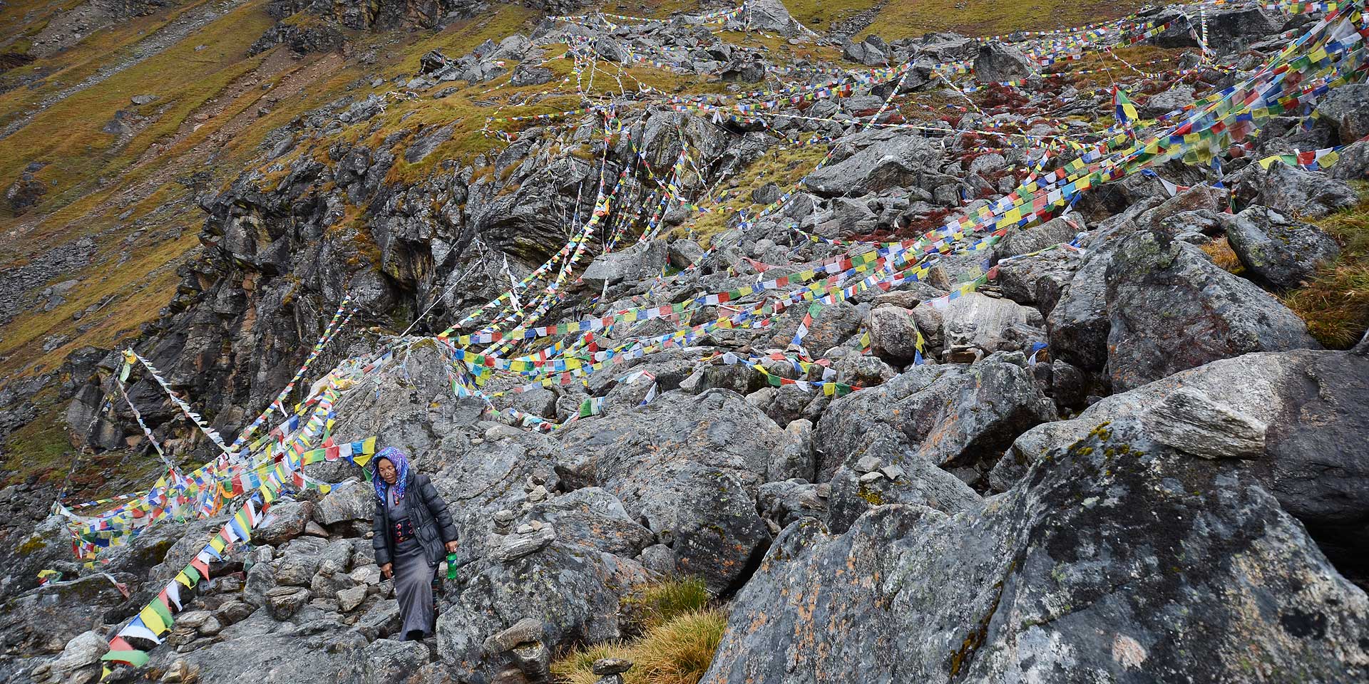 This morning there is time to explore a little around Gosainkund before we need to head down. From the tea houses the trail descends a little way from the Gosainkunda Lake before a small climb to a charming pass where you find a shrine and Bhuddhist prayer flags as well as a lovely view back up towards Saraswati Kund to Gosainkund. From here the trail contours around the mountain through a spectacular rock strewn landscape, leading downwards to a chorten on the ridgeline above the little tea house village of Laurebina. From here you can have magnificent views across Langtang valley to Langtang Lirung and to the west are Himalchuli, Ganesh Himal and Manaslu. From Laurebina, we descend to Sing Gompa on a beautiful forested trail. There is a small monastery, still intact after untold years and a small cheese factory in Sing Gompa.