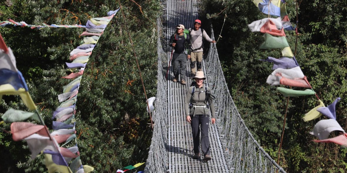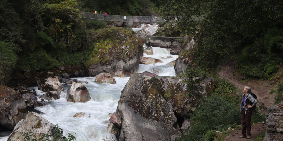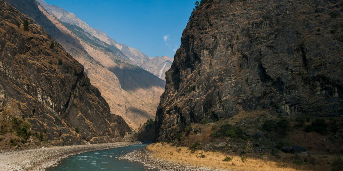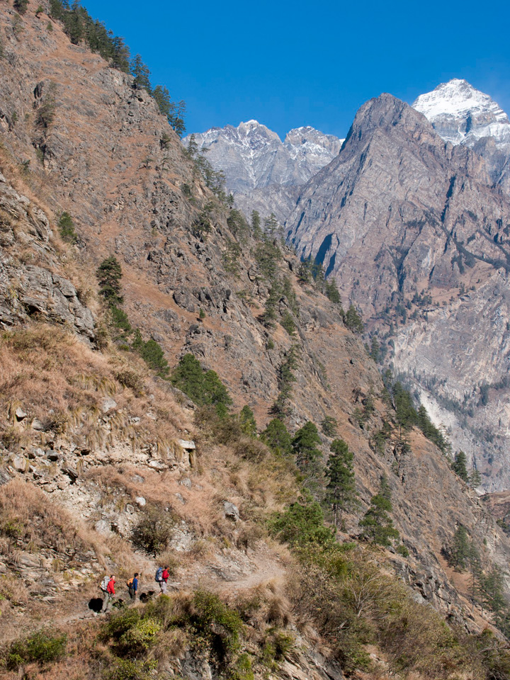 Today we’ll hire a local jeep from Machha Khola to Bhansing, this is a dusty road that is under construction. We start trekking from Bhansing, as the jeep cannot drive any further. Our trek starts by crossing a very long suspension bridge, to Eklai Bhatti (means Lone Tea House), and then on through a narrow, dramatic gorge section with towering walls, and past a thundering waterfall just above us on the right of the trail.