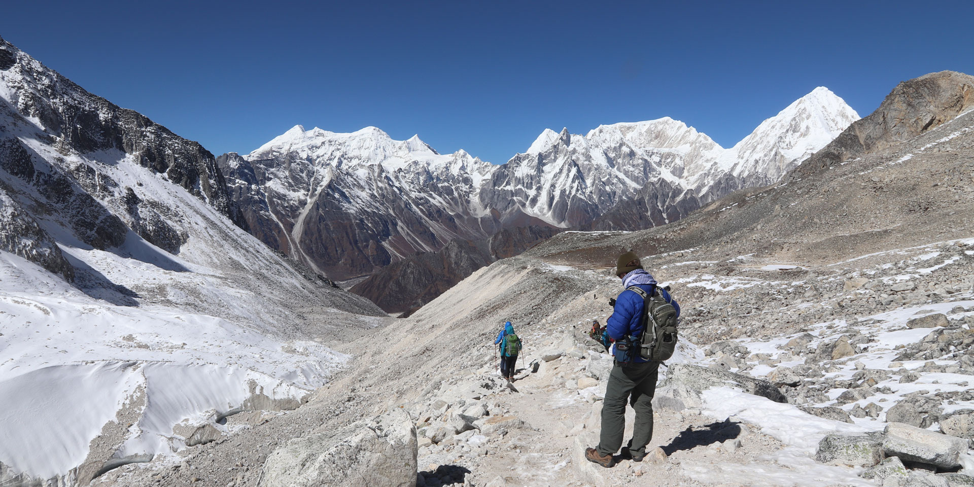 After a short climb, we reach the ablation valley on the North side of the Larkya Glaciers where we have views of Cho Danda and then of Larkya Peak. We continue across the moraines of the glacier, making a gradual ascent which becomes steeper only in the last section to the pass, which should take us about three hours to crest.