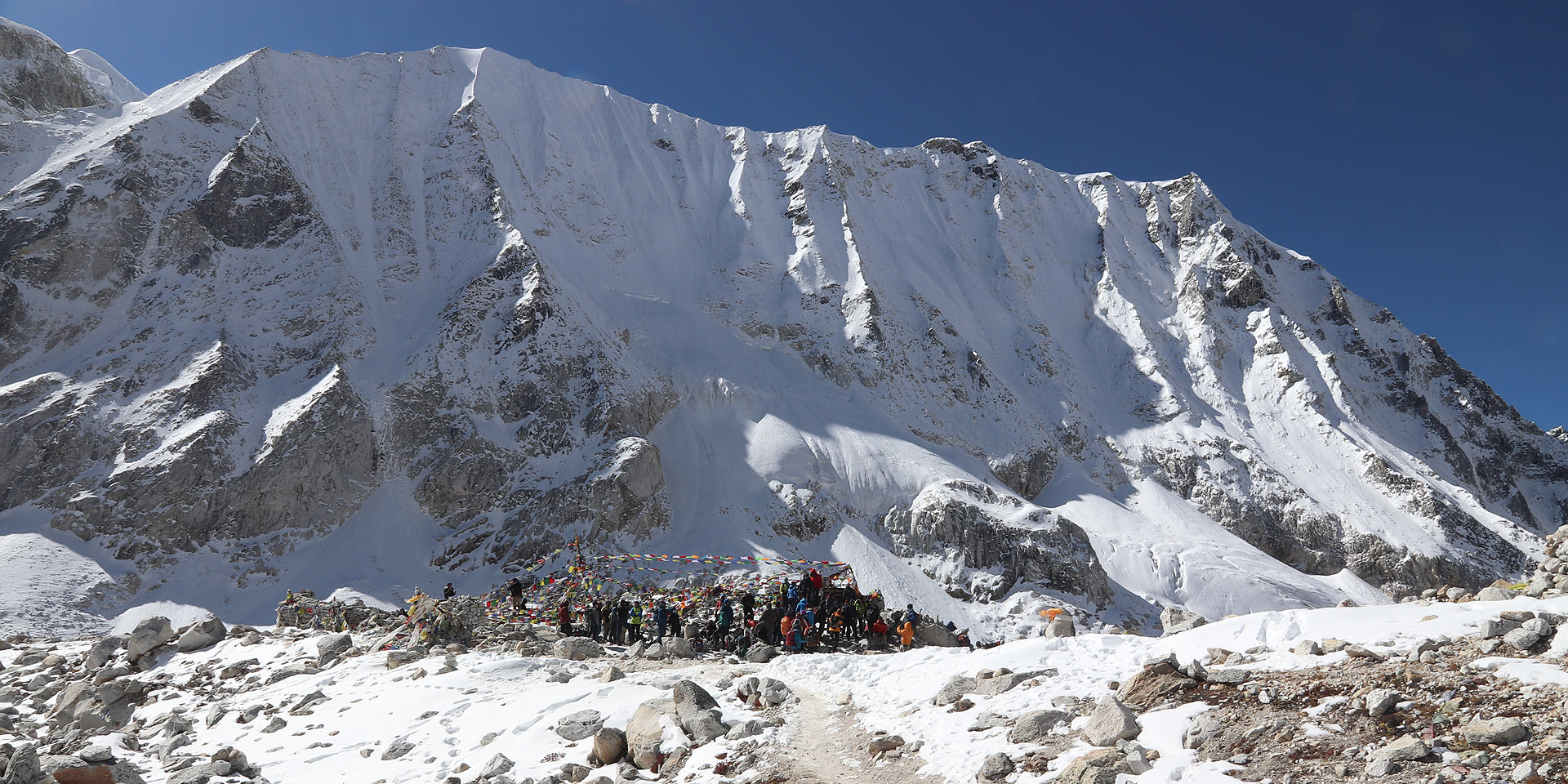 The views from the top of the pass are truly unbelievable. After hanging our Tibetan prayer flags, and yelling ‘Ki ki so so lha gyalo’ (may the Gods be victorious), get ready for a steep, ankle straining drop to a trail following the glacial moraine, very slippery if covered in snow so have your ‘Yak tracks’ ready if you’ve brought them, and definitely use trekking poles.