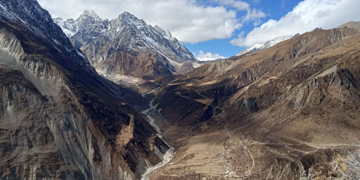 Another day of incredible mountain views during the walk up to Samdo, an easy three hours away. En route we pass the long mani walls at Kermo Kharka, after which we spot the entrance chorten of Samdo high on a bluff. We descend back to the Bhudi Gandaki and cross a small bridge before another short climb to the ‘kane’ entrance of Samdo; look back down the valley for great views.