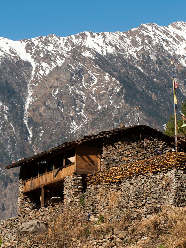Above Ghapsyo we pass through the seemingly deserted seasonal village of Nambachhe, planted with fields of barley and lined with mani walls, we ascend through a dense, cool forest for an half an hour, crossing the Budhi Gandaki once on a wooden bridge, to Namrung, at 2540 meters our stop for the night. As we gain altitude, we reach alpine territory and are treated to increasingly amazing mountain views. Namrung village is the start of Nubri, the region of purely Tibetan inhabitants speaking a dialect of western Tibet.