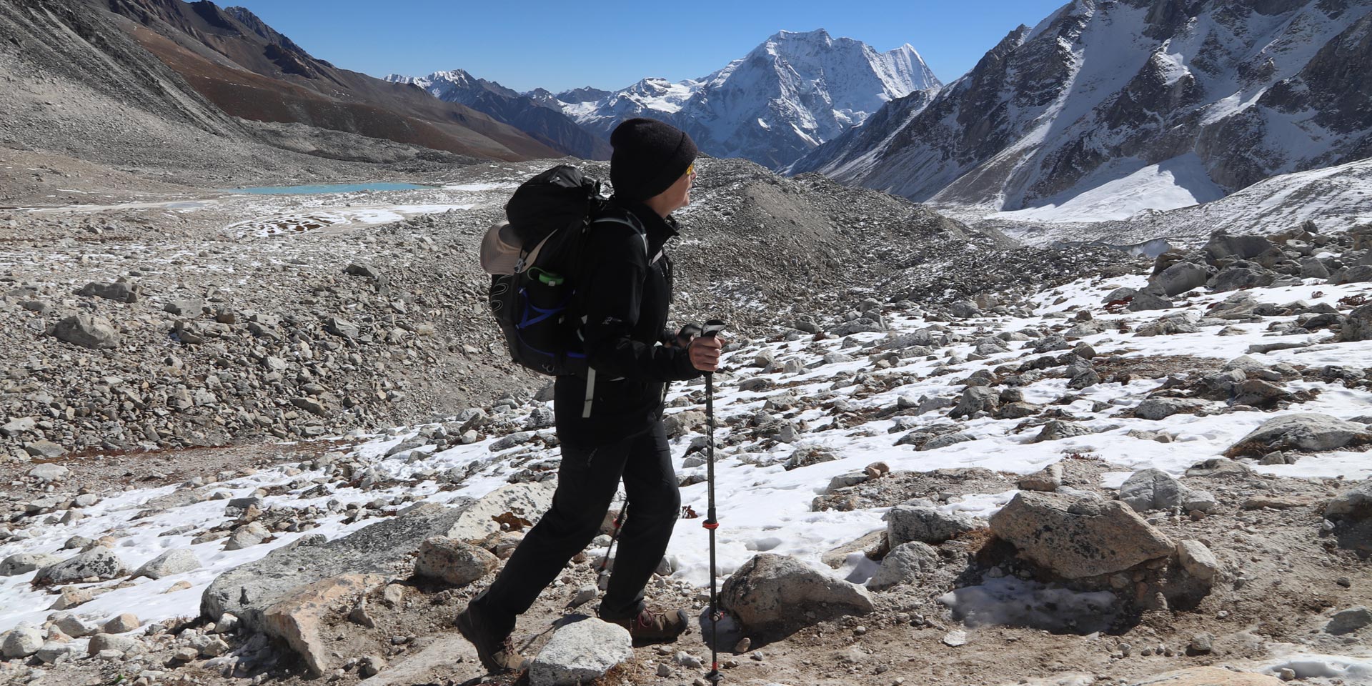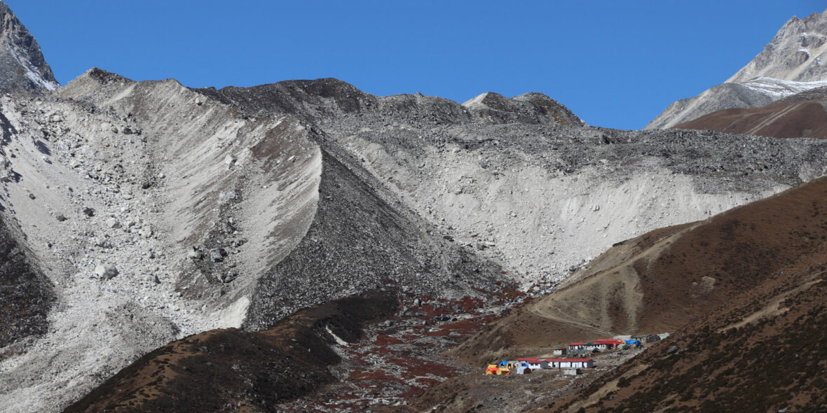 The views from the top of the pass are truly unbelievable. After hanging our Tibetan prayer flags, and yelling ‘Ki ki so so lha gyalo’ (may the Gods be victorious), get ready for a steep, ankle straining drop to a trail following the glacial moraine, very slippery if covered in snow so have your ‘Yak tracks’ ready if you’ve brought them, and definitely use trekking poles.