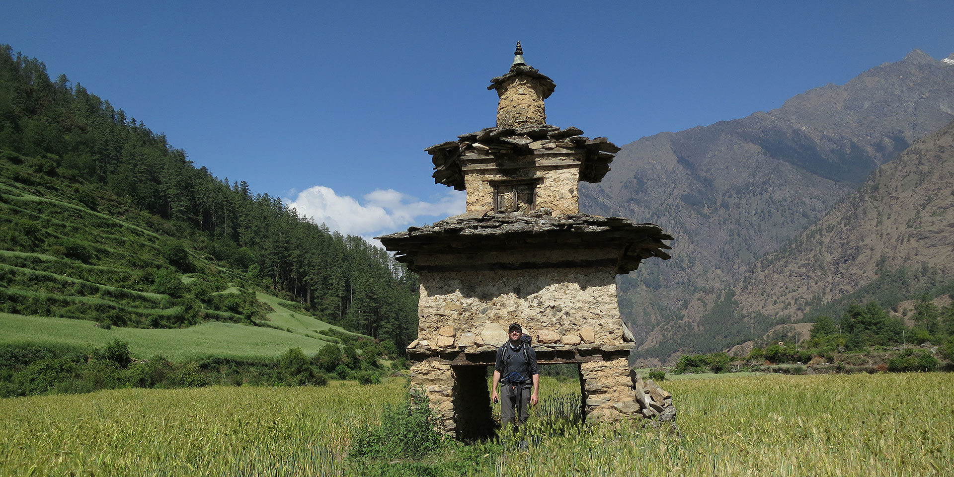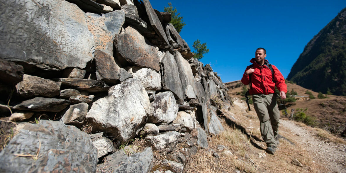 Today is a wonderful trekking day! The valley is still steep-sided and impressive but after about twenty minutes we cross the bridge and switchback up to the village of Rana and then Bihi Phedi, where there is a good shop and views of Kutang Himal. From here we start to see mani stones (prayers etched onto wayside rocks), a sure sign that we are entering another of the tiny footholds of Tibetan culture that mark the high Himalayan places.