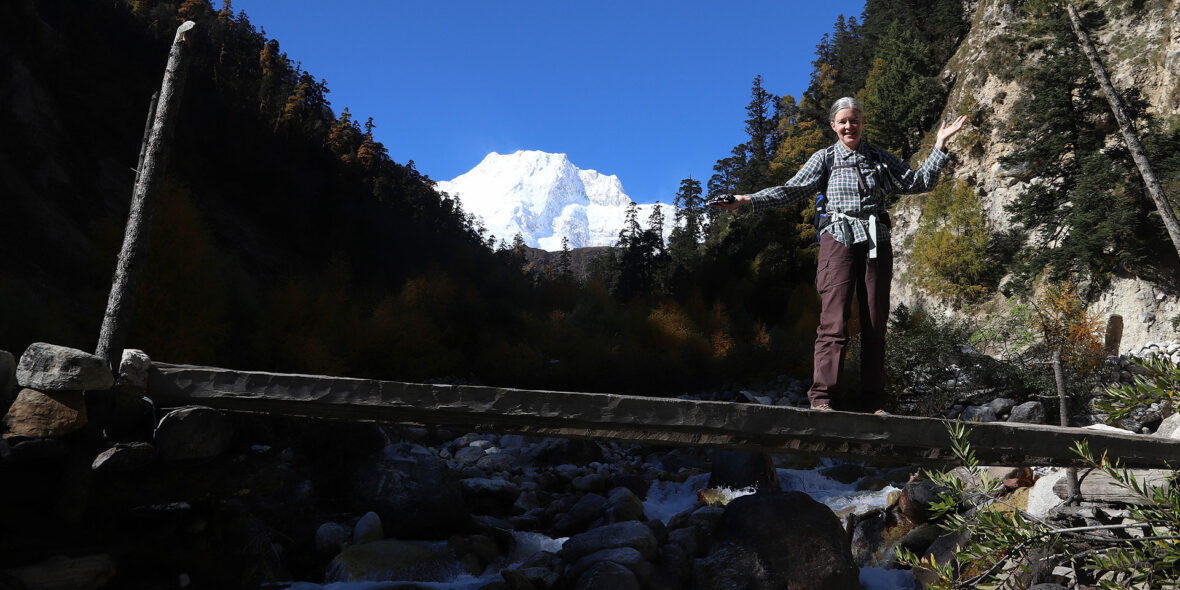 Another hour on the trail brings us to the Nache suspension bridge, and at 412m high, looking down into the gorge below isn’t for the faint-hearted! We have a short climb ahead, we can see one single building and upon arrival at that building, the wonderful little village of Nache opens up in front of us! Perched on the hilltop, high above the agricultural lands below, the space of this small land area is filled with tiny houses and our hotel for lunch. We’re reacquainted with Mt Manaslu once again, peeking through the hills, giving us yet another perspective of the eighth highest mountain in the world, at over 8000m high.