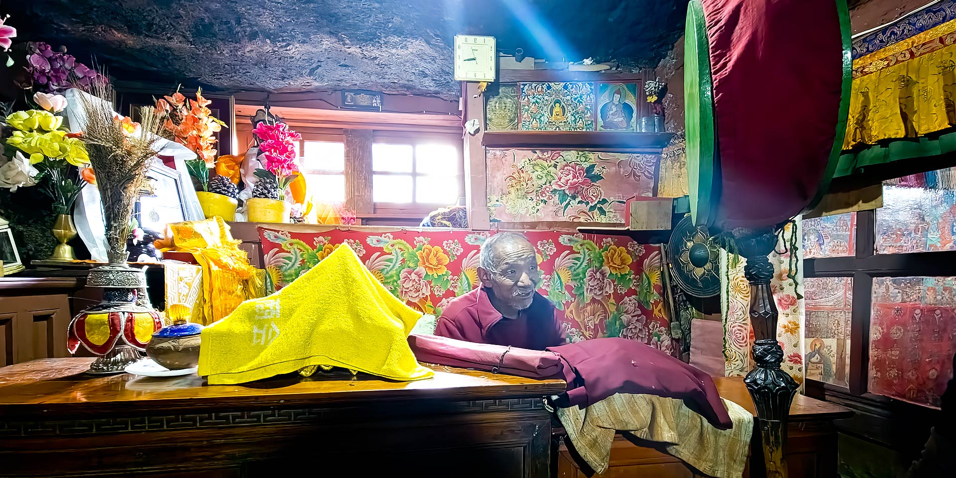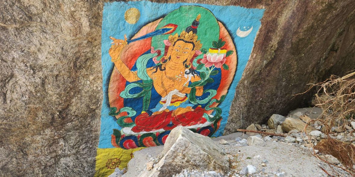 On the way we’ll pass a rock painting of Guru Rimpoche (who is said to be one of the founders of Tibetan Buddhism) and high in the hills above, surrounded by prayer flags fluttering in the breeze, you’ll see a monastery which is a sacred Guru Rimpoche cave retreat. This gompa used to be closed when anyone was in retreat but it is now open all the time with an old monk, who has lived here most of his life, happy to show you around. It will take about half an hour to climb up to the gompa from the main trail, the climb will aid your acclimatisation and the chat and possible tea with the monk is a great experience.