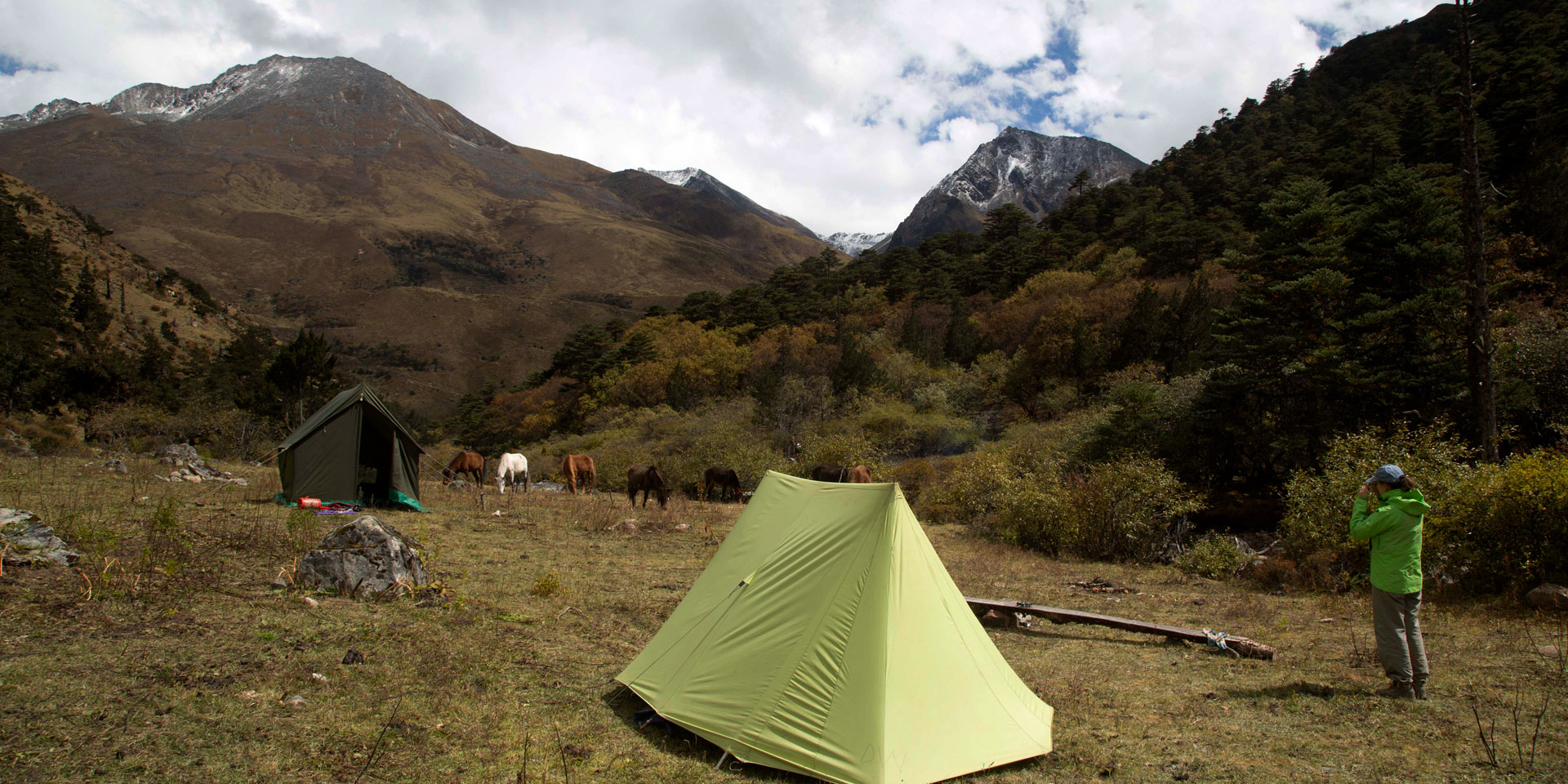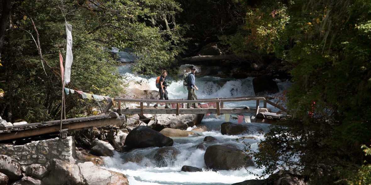 This is a long day, we start early from the hotel in the jeeps driving towards Shana. We follow the Paro Chhu (CHHU: river) up the valley. At Gunitsawa we will have our permits checked before continuing the drive a little while longer to Shana. Here our trekking day starts, it will take us around five hours to reach the campsite. The trail continues to follow the river; gradually ascending through a mixed forest of blue pine and oak and, later in the afternoon, tall rhododendron trees, birch, fir and maple. Though the trail is a rough and rocky path, it is not too strenuous. In rainy conditions it can be quite muddy. There are several simple wooden bridges to cross and sometimes the river reaches right up to the trail.