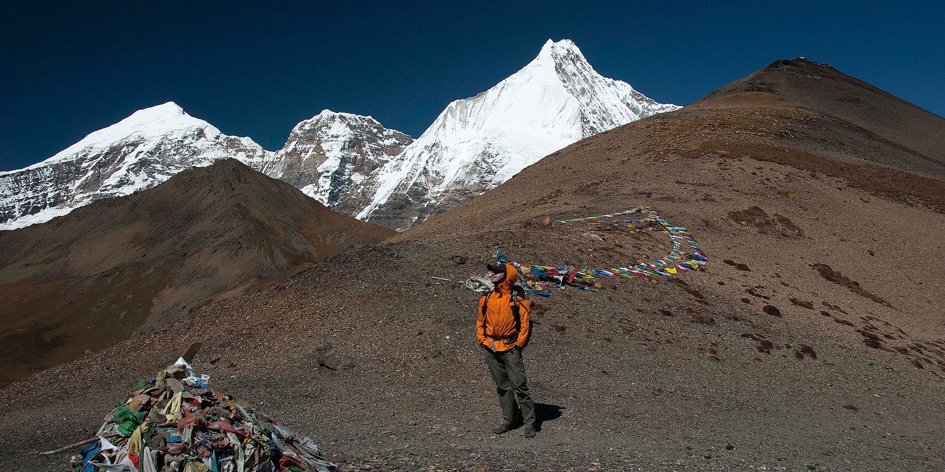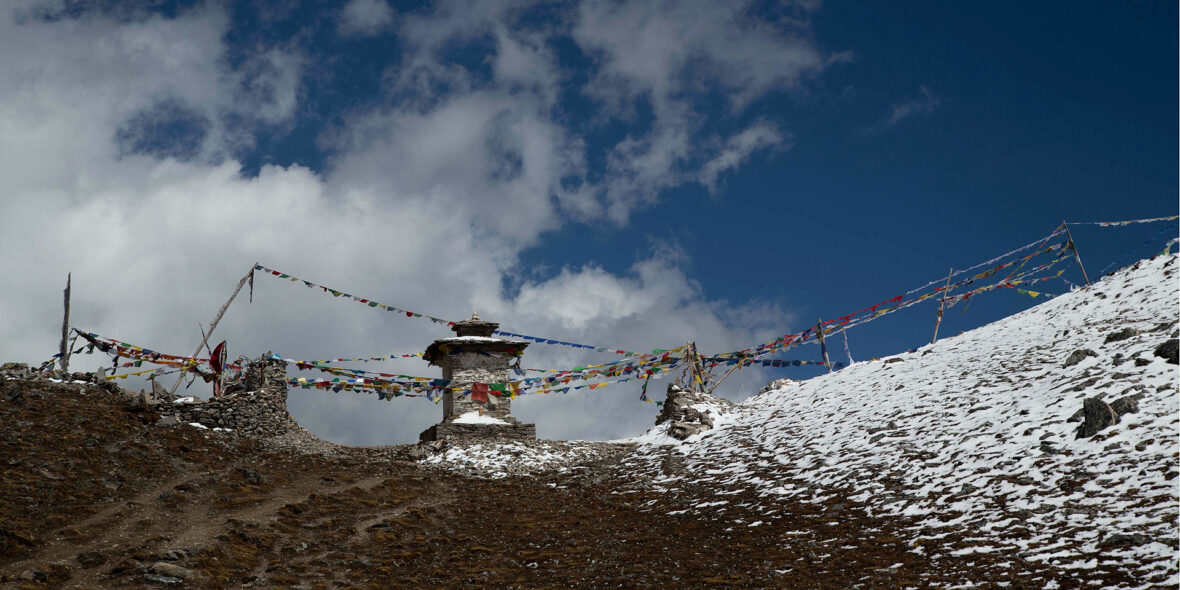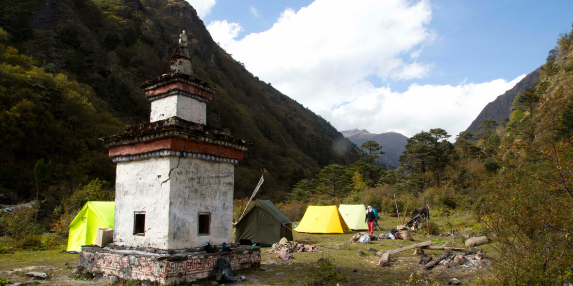 Not long before reaching the campsite, the trail leads you up a ridge with a chorten (CHORTEN: Buddhist monument).