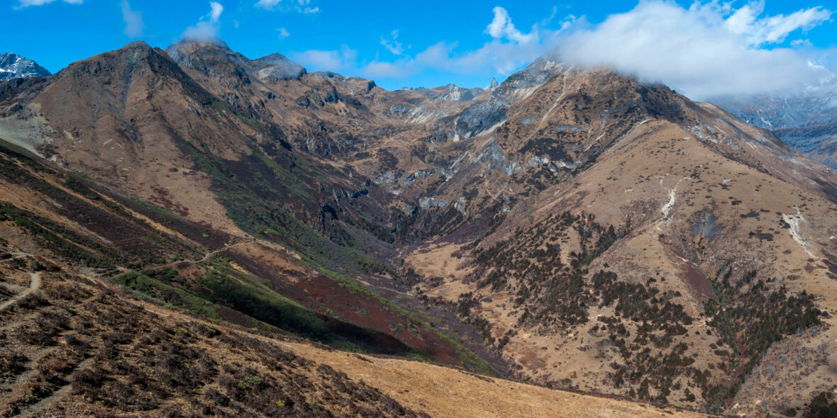 From here, we may have to wade across the stream as the footbridge is frequently washed away. After crossing the stream towards the left bank the trail ascends to Robluthang camp at an altitude of 4160 meters.