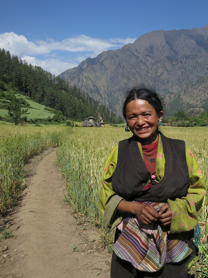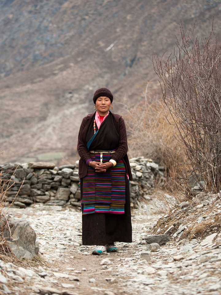 Passing the small shop, we continue to climb on a good trail for another few hours to reach Chhokangparo, where we’ll stop and stay at a homestay for the night. This is one of our favorite villages in the Tsum valley, a scenic and interesting village with friendly villagers and small lanes to explore. There’s a well-stocked shop in town and a local phone, and a home-stay sort of lodge owned by the same couple. The kids are eager to come and play so save some energy. We might have the chance to visit Tashi (of Tsum Valley Homestay)’s mother in their modest Tibetan home for a cup of salt-butter tea, and perhaps we’ll also visit another English-speaking friend, Namgyal, at his much nicer and lighter house. There is lots of weaving happening in this village as in most others in Tsum and Manaslu, and perhaps an opportunity to purchase a hook rug or other textile if you’re interested. The intricate, colorful woven belts adorning most women’s Tibetan-style chubas are unique to the Tsum valley as well.