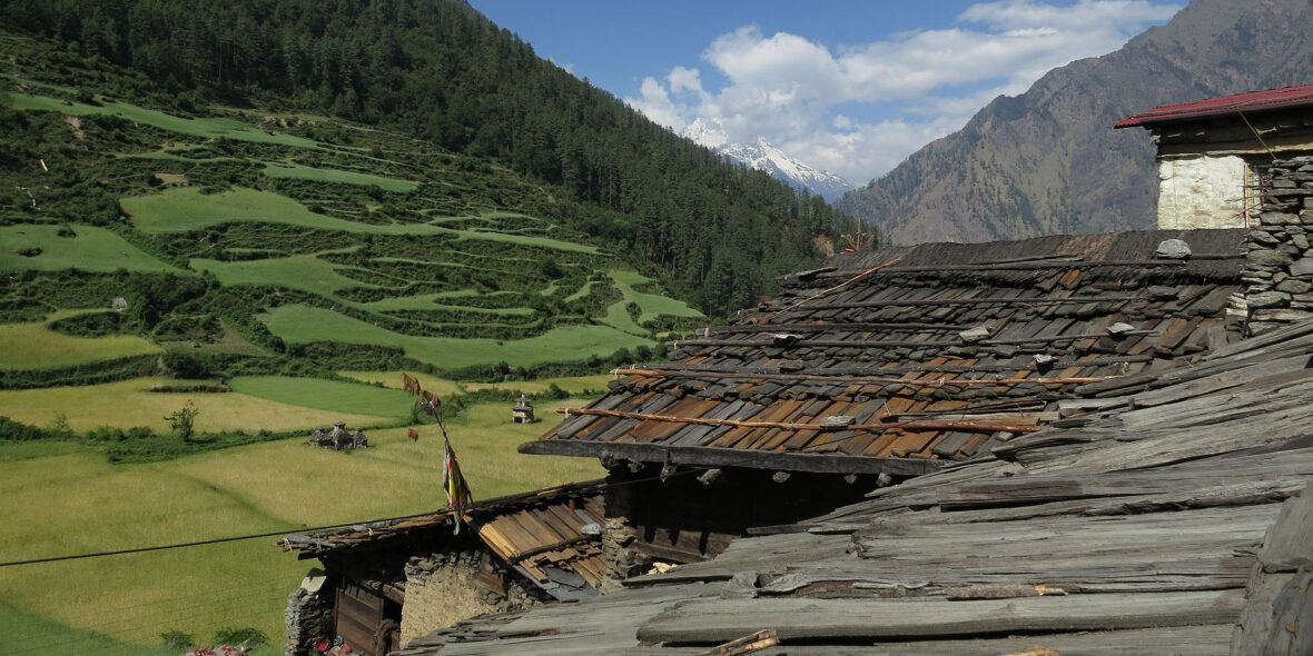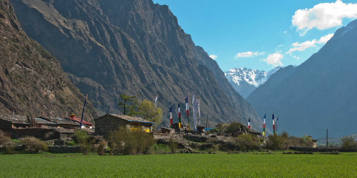 It’s a harder day than it looks on the map to reach Gompa Lungdang but worth the effort to get there for the experience of staying with the friendly nuns and the mountain panorama of the Ganesh Himal peaks surrounding the gompa. Leaving camp the same way we came, we backtrack down the large hill on the switchbacking trail that we climbed a few days previously. When we reach the shop and our friend’s small house at Gho we’ll take a sharp left turn and descend through ferms and dense folliage to the Shiar Khola which we cross on a small, wooden bridge. A short hike through light forest brings us to the green hamlet of Dumje (2450m) where some of the young nuns from Gompa Lungdang stay and study, and the nuns have their barley fields. From where we’ll have an often steep three hour hike far above the Laudang Khola to reach Gompa Lungdang. The views are great along the way and there are plenty of resting points en route. Note that the first time you’ll see Gompa Lungdang from the second vertical prayer flag pole on a ridge it’s still a good hour and a few hundred meters away.