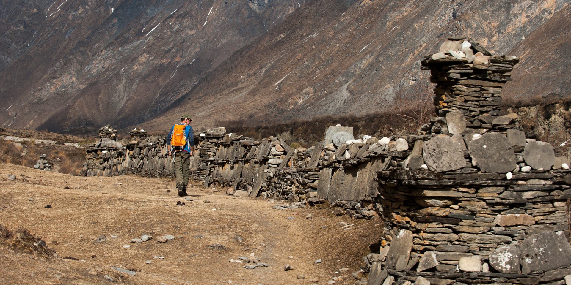 Heading further north towards the border of Tibet, our destination for today is the somewhat remote Mu Gompa, the furthest settlement in the Tsum valley. This last section of trail is more desolate and more difficult as we’ll gain 400 meters in the next two hours to Mu Gompa at our highest spot in Tsum. The trail sticks to the left of the river, passing still more mani walls and chortens as it climbs and contours towards the north. After crossing an old ‘slip’ and a small bridge over a glacial stream, we climb a bit more steeply past several larger chortens, with Mu Gompa just above us.