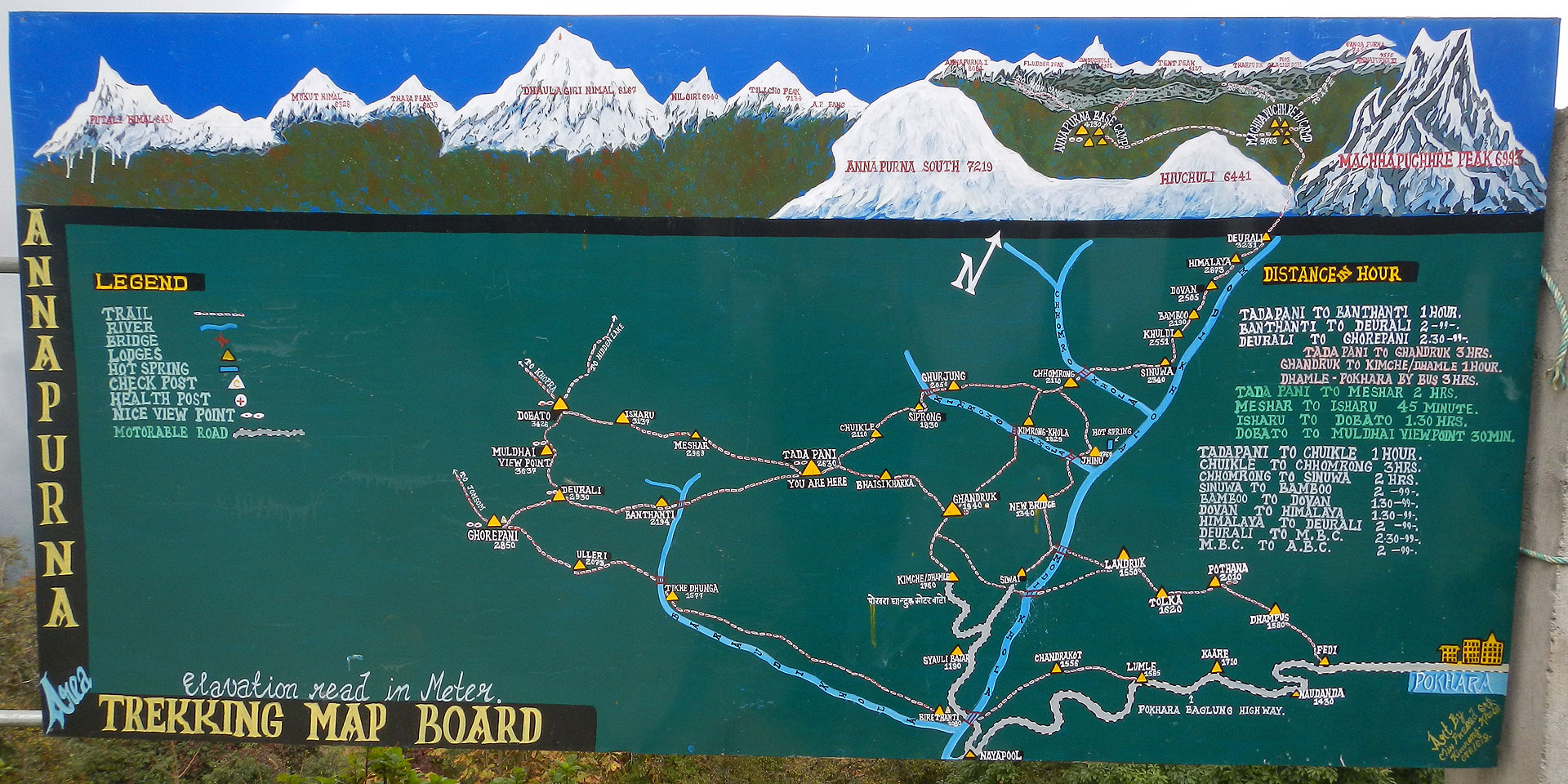 After Poon Hill it is a short steep downhill to Ghorepani, where we are on the main trail again and there are likely to be lots of travellers passing through this ridge-top settlement in both directions. Ghorepani literally means “horse water” and is a popular stopping place for the mule trains which ply the route from Pokhara to Jomsom and beyond. The impressive peak which can be seen across the broad valley of the Kali Gandaki to the northwest is Dhaulagiri.