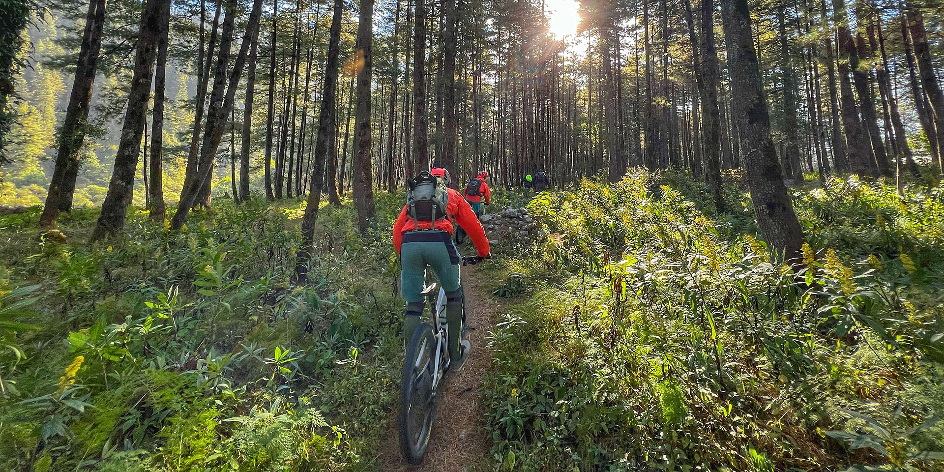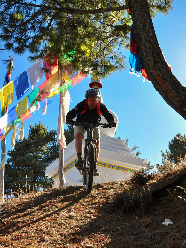 We’ll transfer to Shivapuri National Park and head to the top of a hill on the northern rim of the valley, where we’ll explore some of the valley’s most iconic trails, including Heaven and the Helipad Trail. As we ride through the jungle, we’ll enjoy spectacular views of the Kathmandu Valley, followed by a brief ascent on a jeep trail. The trail then follows a delightful ridgeline that leads us right into town. While not overly technical, the trail is engaging and provides a perfect introduction to our Nepal adventure. We’ll ride all the way to the iconic Stupa at Boudhanath, where we’ll stop for lunch.
