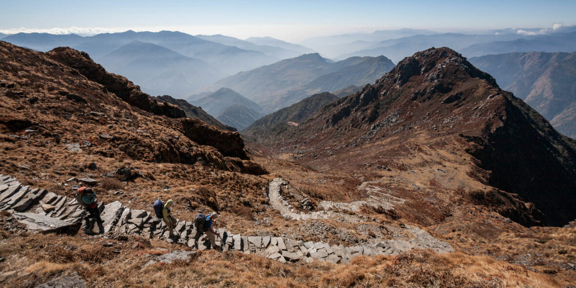 The last 300 to 400 metres of the ascent to the Zatrwa La will be our last climb of the trip, with superb views southwards across the ridge and valley landscape of Nepal’s Middle Hills. From the crest of the pass we trek downhill, steeply in places, for almost 2000 metres to the welcoming lodges of Lukla.